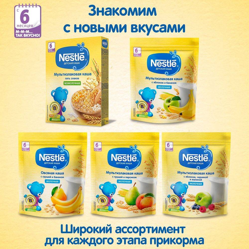 Идеальной пищей для грудного ребенка является молоко матери. Всемирная организация здравоохранения рекомендует исключительно грудное вскармливание в первые 6 месяцев и последующее введение прикорма при продолжении грудного вскармливания. Компания Нестле поддерживает данную рекомендацию. Каша Нестле «Мультизлаковая безмолочная» - с 6 мес. в соответствии с Законодательством РФ. Требуется консультация специалиста