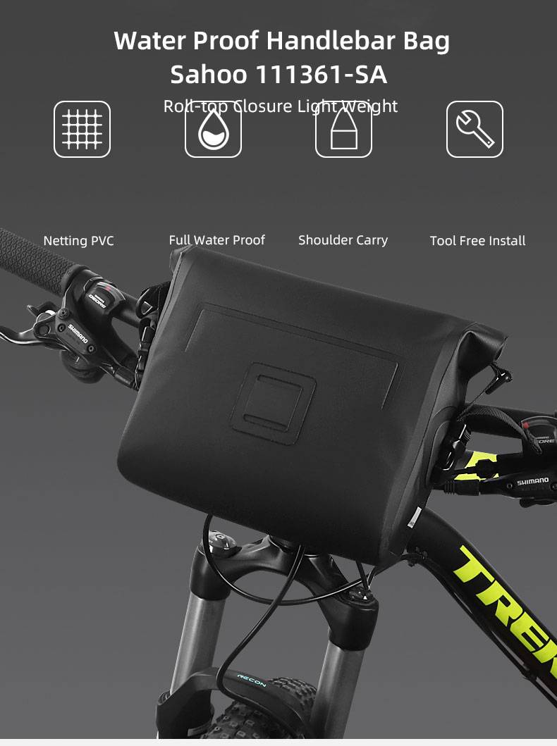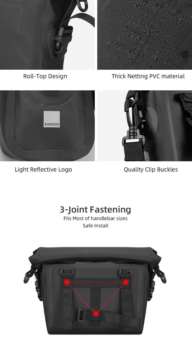 -Изготовлен из водонепроницаемого материала, проклеен швами, желательная Водонепроницаемая производительность; -Рулон-верхнее закрытие облегчает регулировку громкости для удовлетворения конкретных потребностей хранения; -Устойчивые к разрывам ткани, долговечные в использовании и легко чистятся при помощи протирания; -PE доска с подкладкой, чтобы представить сумку в твердой форме; -3-точечный застежка обеспечивает для того чтобы оставаться стабильным на руль; -Ремешок спереди в качестве вешалки для крепления предупреждающей лампы; -Поставляется с ремнем для ношения на плече.
