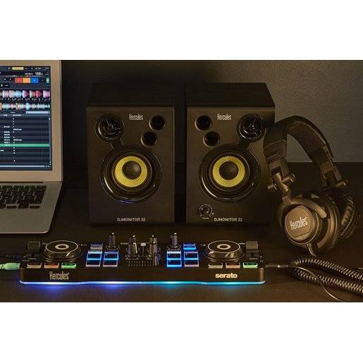 Комплект Hercules DJStarter: комплексное, удобное в переноске и установке решение, включающее контроллер Hercules DJControl Starlight, динамики Hercules DJMonitor 32, наушники HDP DJ M40.2 и Serato DJ Lite.