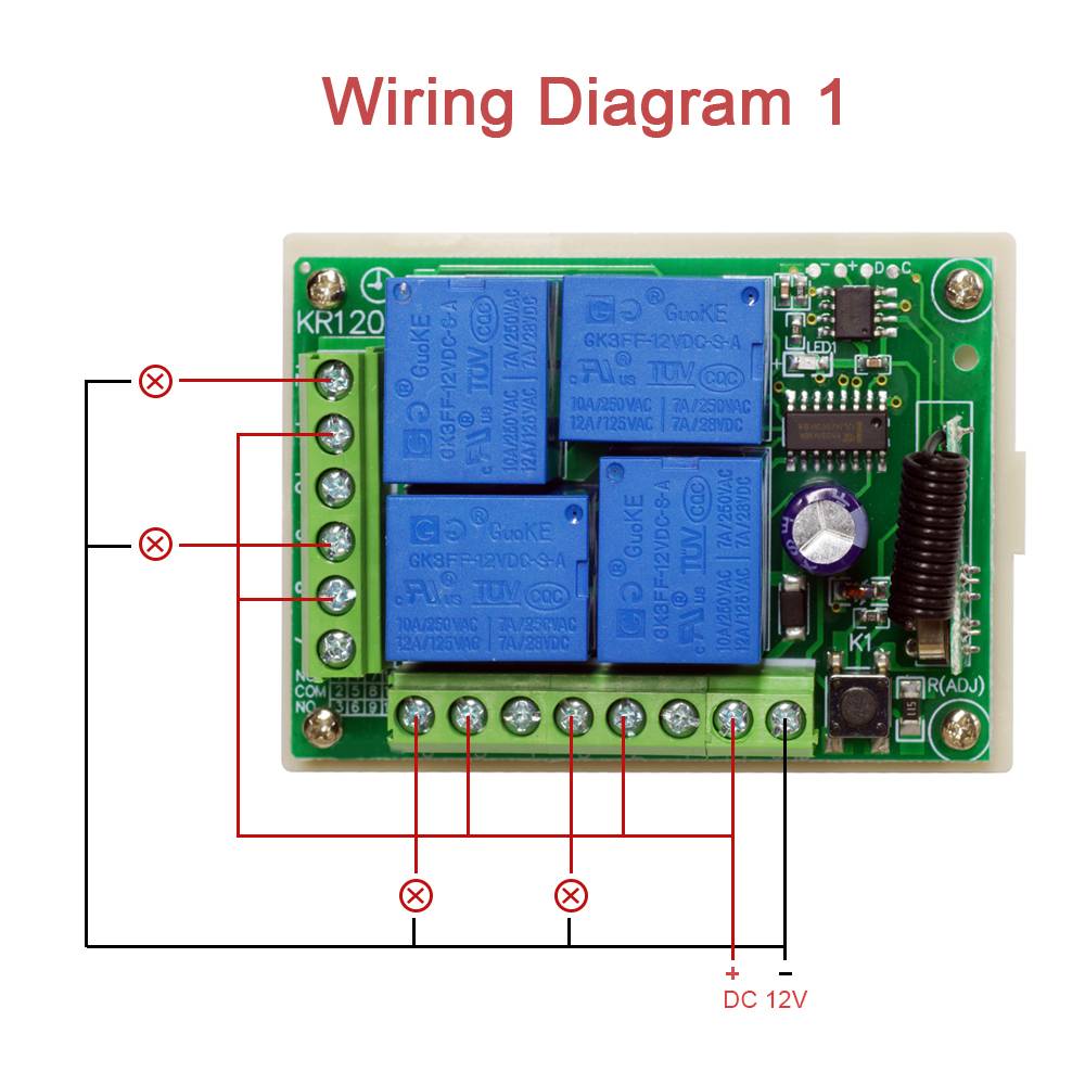 + V = Положительный полюсный вход. GND = вход отрицательного полюса. 1.KC1 нормальное закрытие реле (NC). 2.KC1 Общие Реле (COM). 3.KC1 нормальное открытие реле (NO). 4.KC3 нормальное закрытие реле (NC). 5.KC3 Общие Реле (COM). 6.KC3 нормальное открытие реле (NO). 7.KC2 нормальное закрытие реле (NC). 8.KC2 Общие Реле (COM). 9.KC2 нормальное открытие реле (NO). 10.KC4 нормальное закрытие реле (NC). 11.KC4 Общие Реле (COM). 12.KC4 нормальное открытие реле (NO). (Когда реле заряжено, нет и COM подключено).