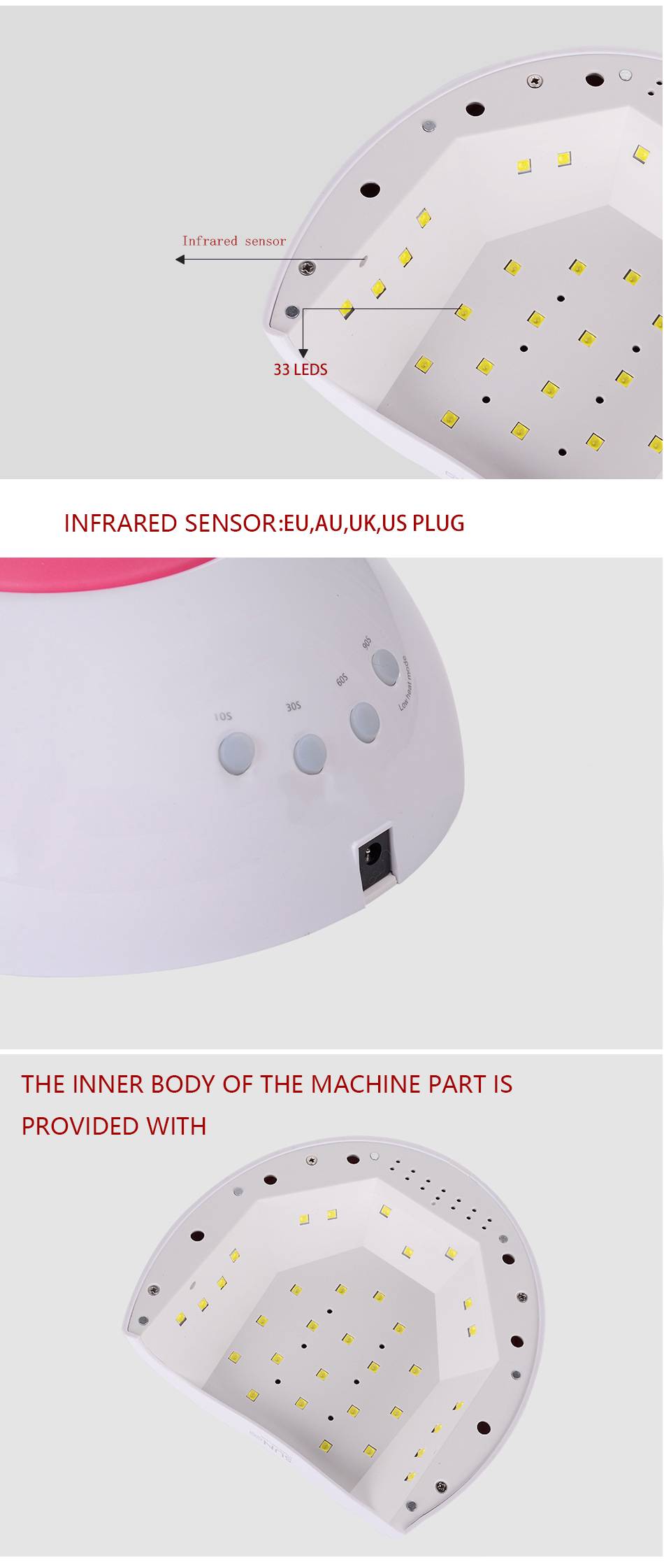 Вес: 0,8 кг Размер: 20*17*10 см Применение: Выпекание всех типов геля для ногтей Модель: SUN 2C Мощность: 48 Вт Длина волны: 365нм + 405нм Мощность: 100-240 В 50/60 Гц Вилка: ЕС/США Режим времени: 30S / 60S / 90S Бусины лампы: 33