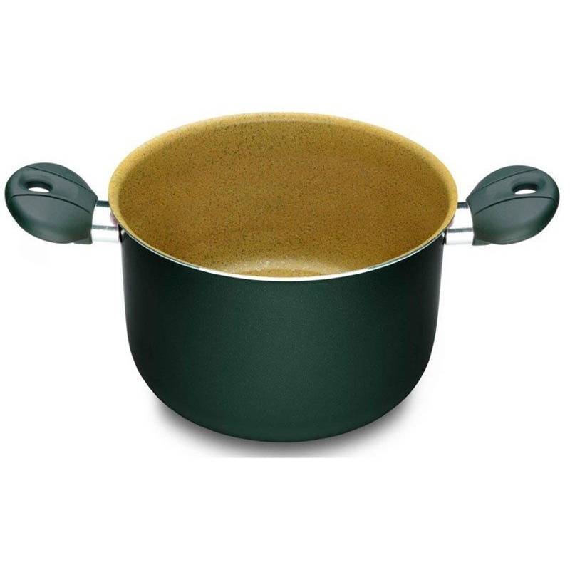 Внутреннее покрытие: эксклюзивное антипригарное Ollia-Tech на основе оливкового масла. Внешнее покрытие: силиконовая краска зеленого цвета. Дно: шлифованное. Ручки: несъёмная с эффектом soft touch. Можно мыть в посудомоечной машине.