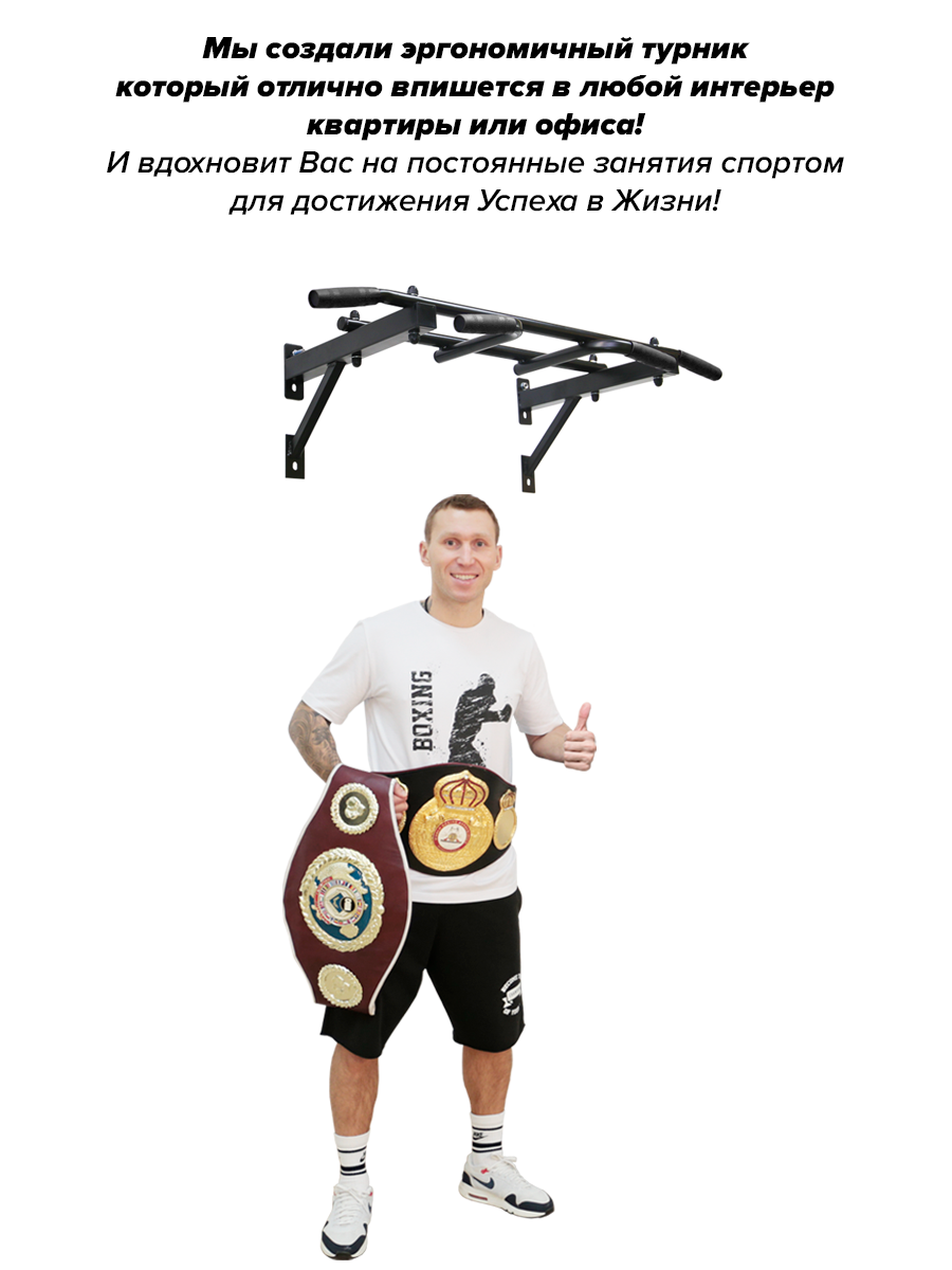 Турник настенный Треххватный "Нью" заряженный успехом чемпионов! Отличный спортивный тренажер, специально для вас, был разработан действующим чемпионом Мира профессиональным боксёром Андреем Сироткиным и изготовлен фабрикой спорттоваров Absolute Champion. Профессиональный турник для дома производится из надёжного профиля 40*40. Для удобных тренировок мы сами изготавливаем ручки из комфортной и долговечной резины.