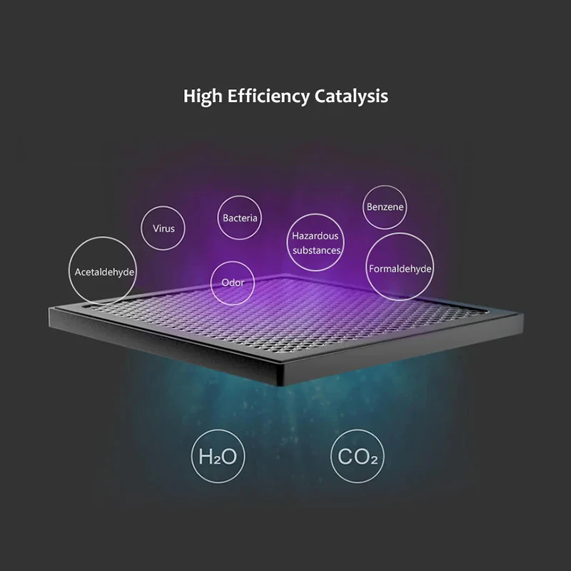 Фотокатализатором обладает сильным каталитический эффект под облучение, защита от ультрафиолета, светильник, и эффективно раскладывается газообразного органического загрязняющих веществ, таких как бактерии, вирусы, запахов и летучих органических соединений PM2.5 течет через фильтрующий элемент. Эти материалы будут преобразованы в безвредные вещества, такие как вода и углекислый газ, и стерилизованы. Уровень дезодорирования составляет 99%