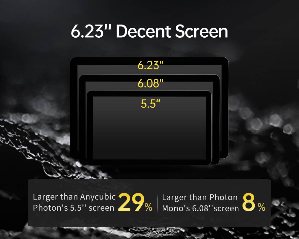 AnyCubic Фотон подойдет как для повседневной носки, так 4K оснащен приличный 6,23 ''сенсорный экран, который является 29% больше того, что вы AnyCubic Фотон с 5,5'' сенсорный экран и 8% больше того, что вы Фотон подойдет как для повседневной носки, так и 6,08 ''в область экрана.