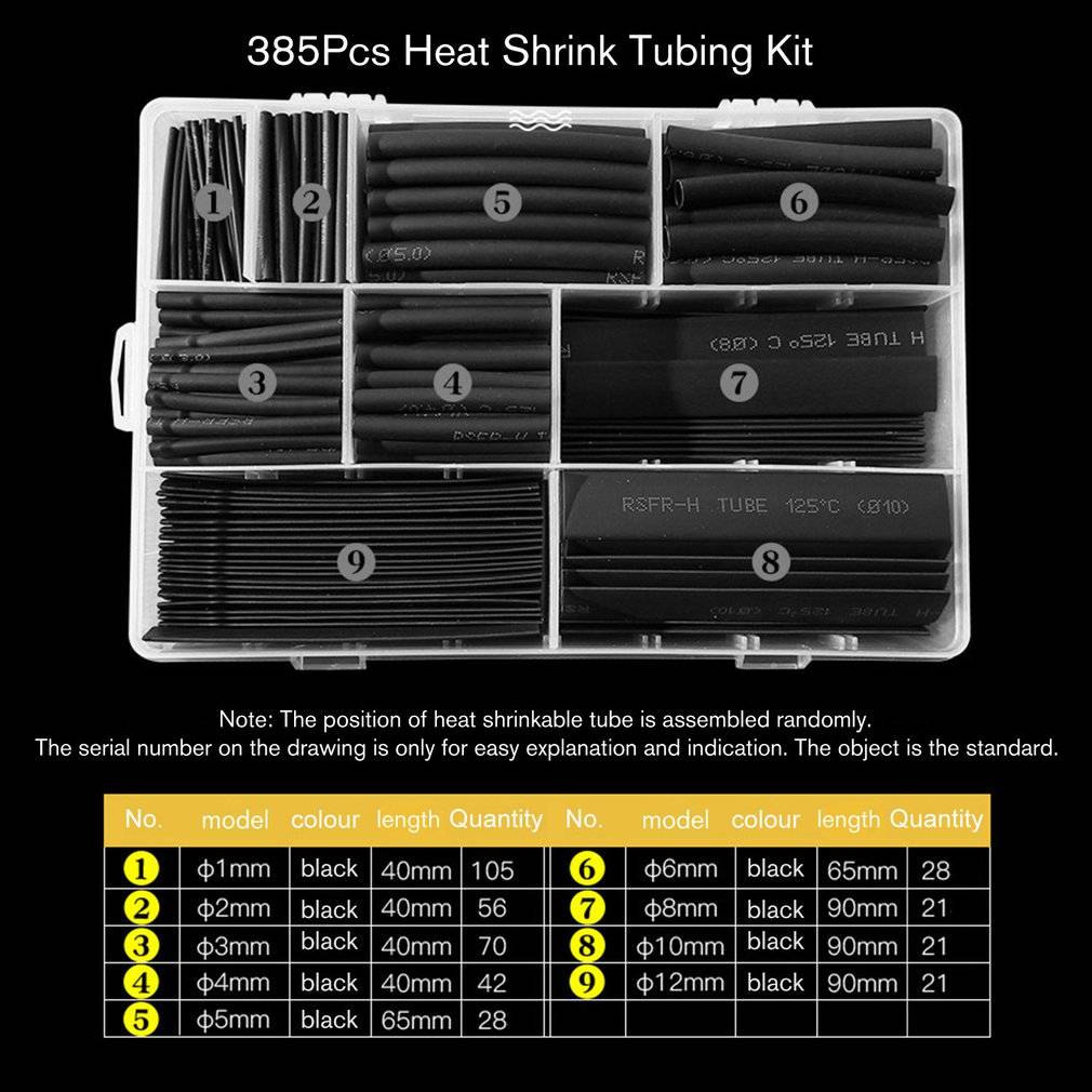1. Большая коллекция термоусадочных труб, 9 спецификаций, черные цвета, 385 шт.