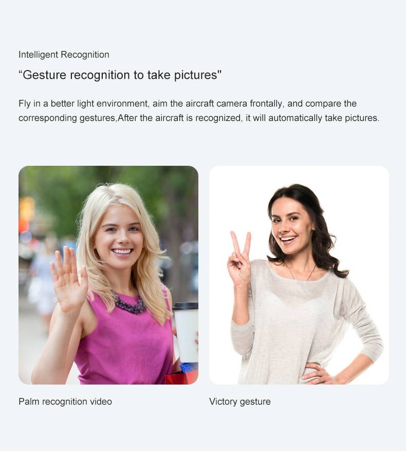 -Камера 4K ESC: оснащена двухосевым стабилизированным стабилизатором стабилизации стабилизатора, широкоугольной 120 ° ESC-камерой (угол наклона камеры можно регулировать с помощью пульта дистанционного управления, 90 °) -Интерфейс приложения мобильный телефон отображает состояние и данные GPS полета, может делать фотографии и видео и управлять -GPS возвращается в пункт взлета одной кнопкой, низкий заряд батареи и потеря сигнала автоматически вернется домой -Функция извлечения самолета: нажмите на значок GPS сигнала 3 раза, чтобы открыть интерфейс карты, карта отображает последнее расстояние, широту и долготу самолета. -GPS smart follow: определение предмета и автоматическое отслеживание полета. -Многоточечное планирование маршрута полета: самолет будет летать автономно в соответствии с заданным маршрутом, а игрок сосредоточится на стрельбе. -Облетайте точку: (линза всегда находится в мишени) Найдите центральную точку круга, а затем с помощью джойстика перемещайте нужный радиус круга. -Распознавание съемки жестами: в пределах 1-3 м от самолета лицом к камере, чтобы сделать фото Жест/жест камеры. -Можно добавить изображение, музыку и видео: один или несколько вариантов для совместного использования фотографий, видео можно поделиться только по отдельности за раз.
