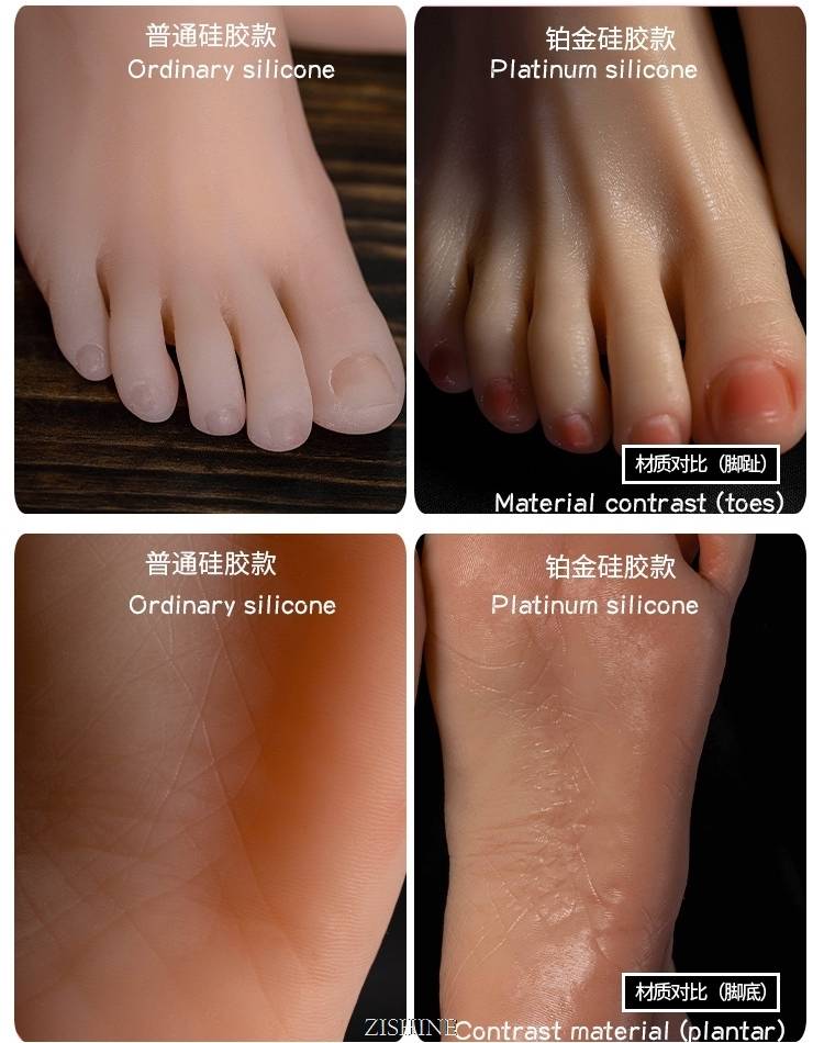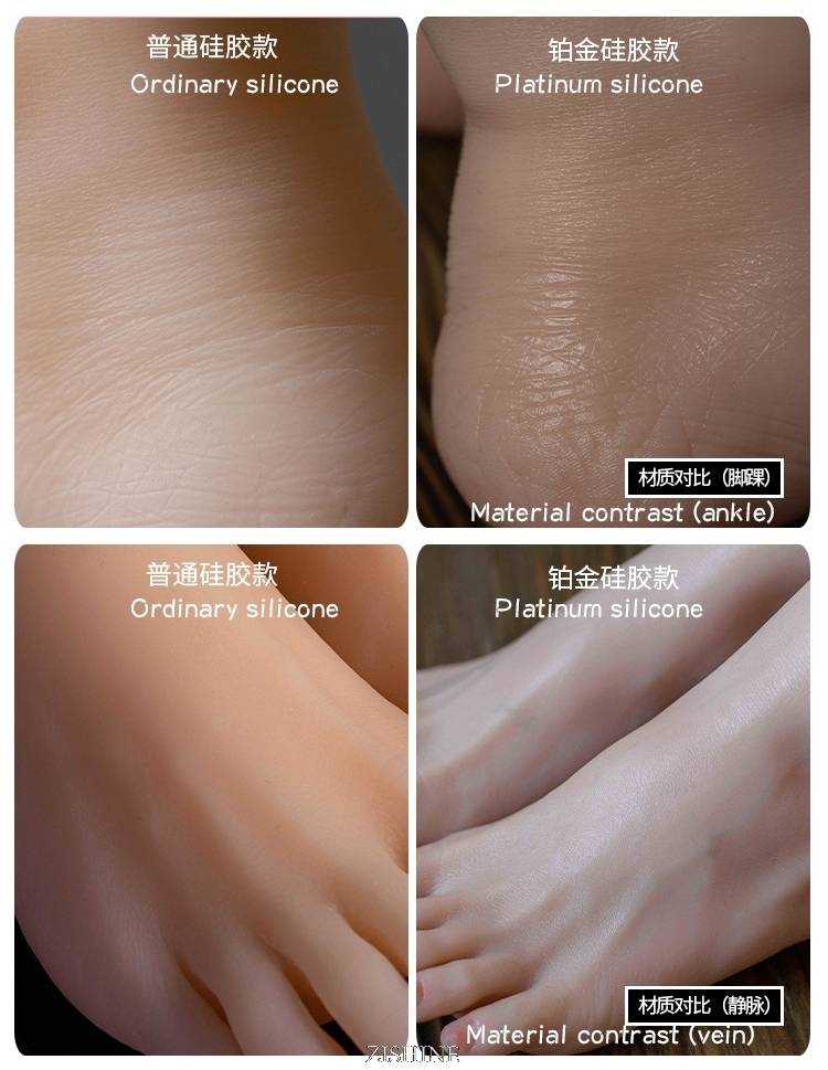 ①Полностью Мягкий силикон: полностью изготовлен из жидкого силиконового материала, целые ноги без встроенных костей. Пальцы могут быть согнуты, но не могут быть зафиксированы. Все подошвы и лодыжки и пальцы ноги мягкие и могут быть согнуты по желанию, как толстый резиновый ремешок.
