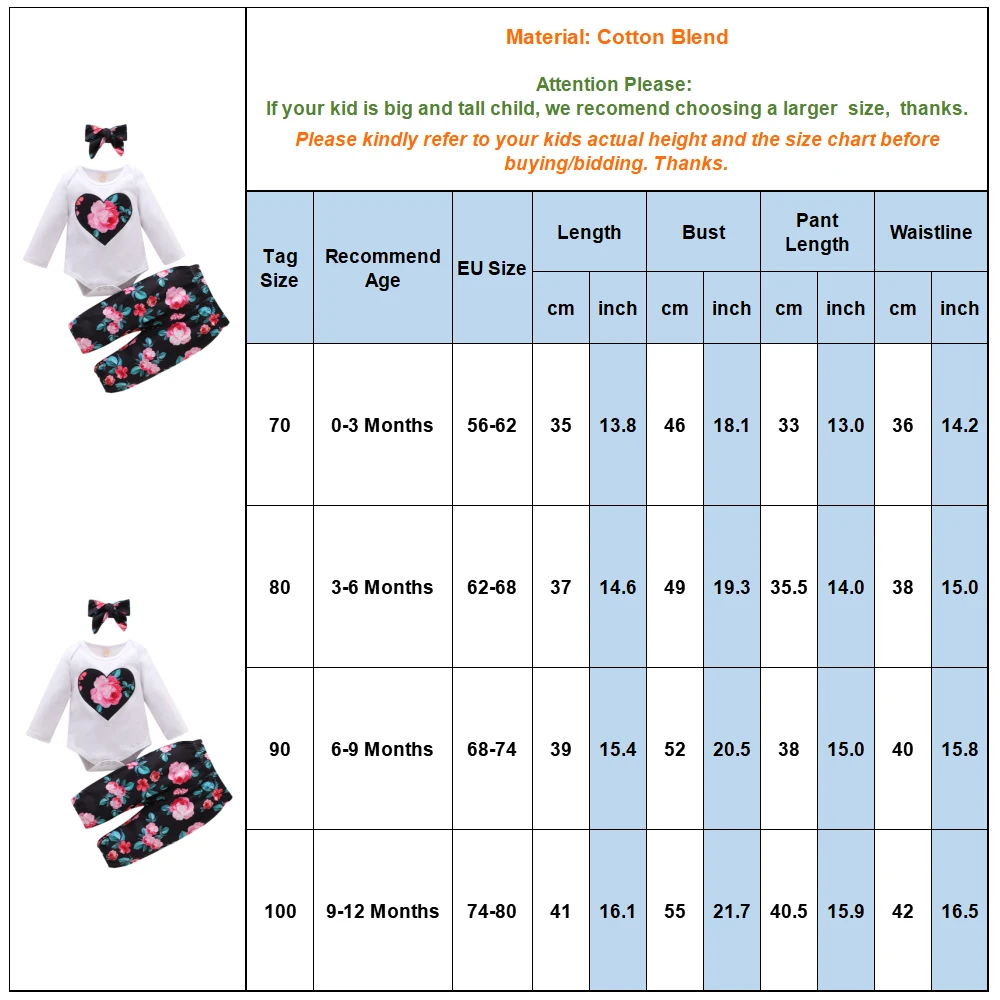 Особенности: Сезон: весна, лето, осень Повод: ежедневно Точный Материал: смесь хлопка Стиль: повседневный Принт: цветочный Украшение: принт Воротник: круглый Длина рукава: длинный Тип рукава: Обычный Размер: 0-3 м, 3-6 м, 6-9 м, 9-12 м Посылка: 1 боди Брюки-1 шт. Повязка на голову-1 шт. Об этом товаре (мы стремимся показать вам точную информацию о продукте): 1. Пожалуйста, сравните детальные размеры с вашими перед покупкой! 2. Цвета могут немного отличаться в зависимости от настроек компьютера и монитора 3. Пожалуйста, учитывайте разницу в 1-3 см из-за ручного измерения, спасибо (все измерения в см и обратите внимание, что 1 см = 0,39 дюйма) Спасибо за понимание. РазмерCХарт: