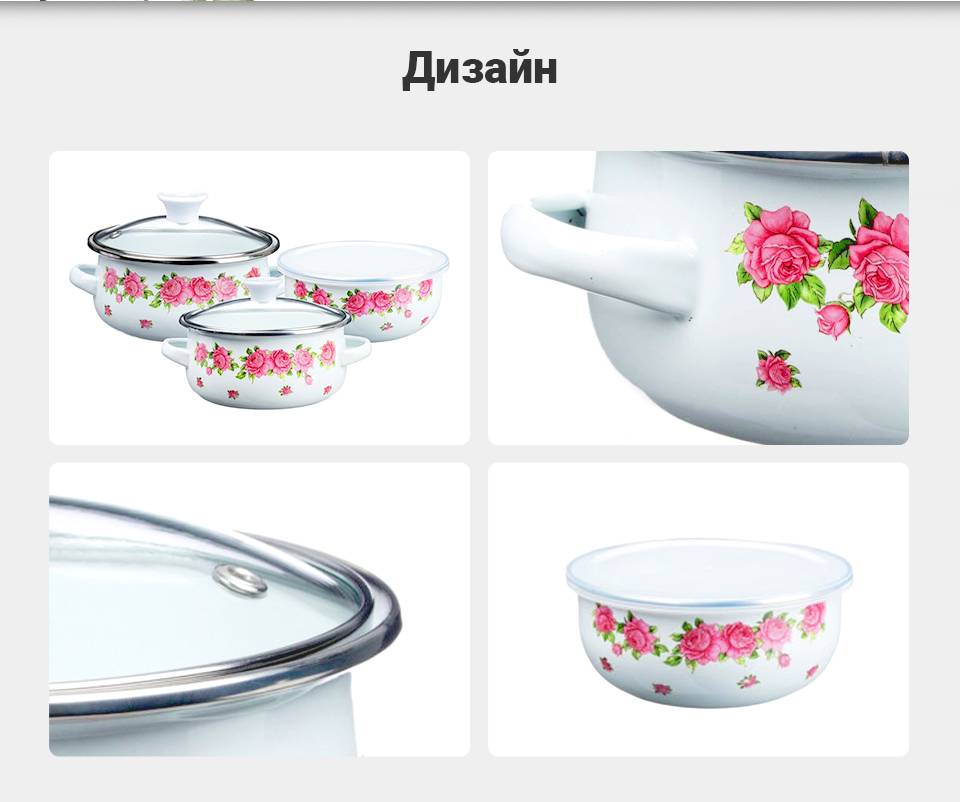 Набор кухонной посуды «Роузи» изготовлен из качественной эмалированной стали, которая является абсолютно безопасной, так как не вступает в реакцию с пищей и не выделяет вредных веществ.