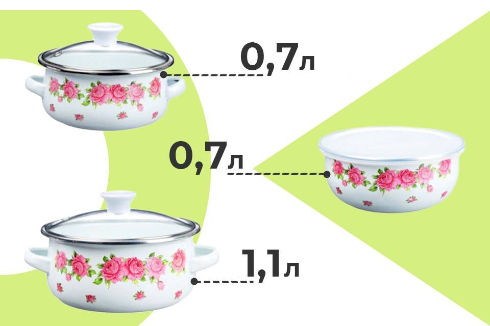 Две кастрюли объёмом 0.7 и 1.1 л, а также вместительный салатник закроют потребность в инвентаре для приготовления и хранения пищи.