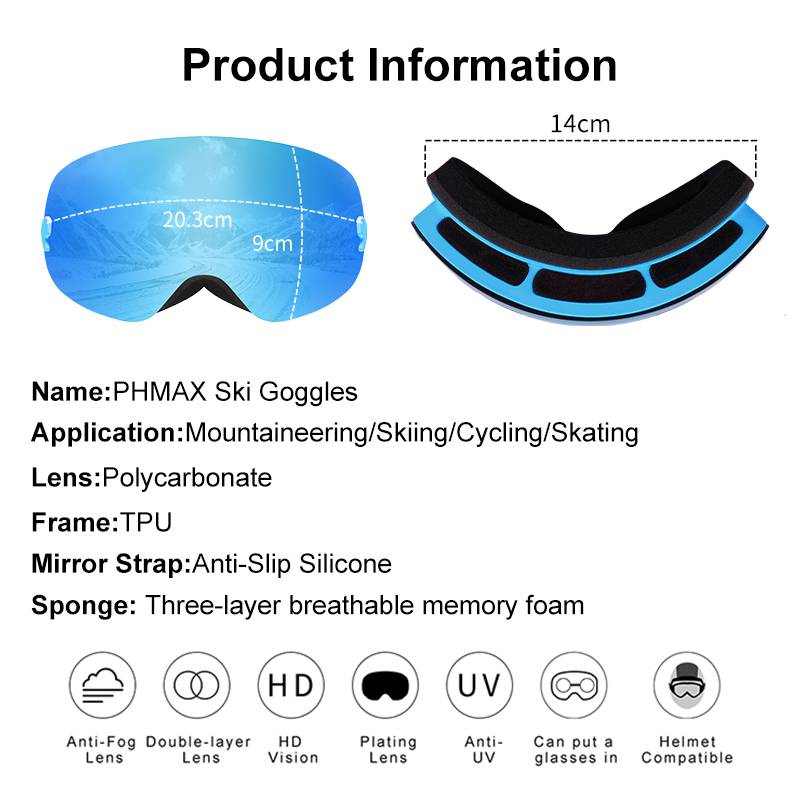 Благодаря сильным солнечным лучам, отраженный свет от Снежная гора плюс с защитой от холодного ветра, которые стимулируют глаза, мы предлагаем вам выбрать безопасности профессиональные лыжные очки, в то время как бренд "PHMAX»-это ваш лучший выбор. PHMAX лыжные очки больше подходят для вашего лица и могут предотвратить ваши глаза от сильного ветра. Объектив изготовлен из импортной материал и зеркальным покрытием закалена, устойчивый к царапинам и износостойкость. Очки, защита от УФ лучей, играет ключевую роль в защиты глаз.