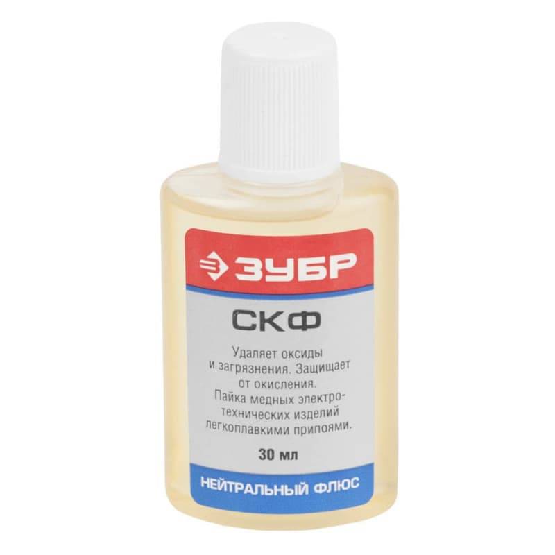 Флюс СКФ Зубр 55478-030 применяется для пайки элементов радиомонтажа и печатных плат легкоплавкими припоями. Необходима отмывка спиртом, бензином или ацетоном.