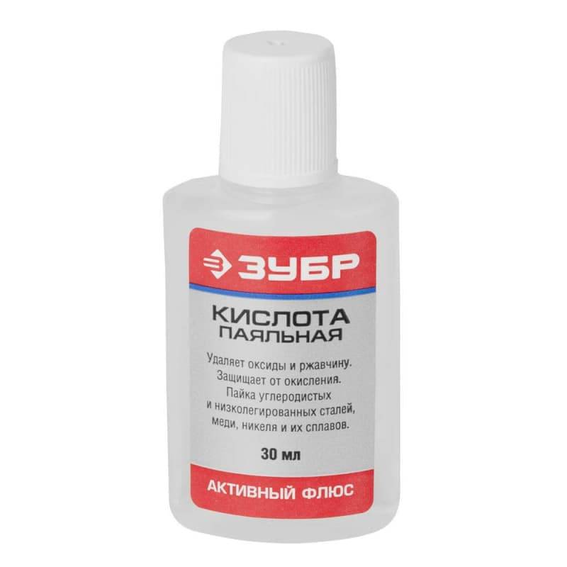 Кислота Зубр 55491-030 применяется для пайки углеродистых и низколегированных сталей, меди, никеля и сплавов. Необходима отмывка 5% раствором кальцинированной соды.