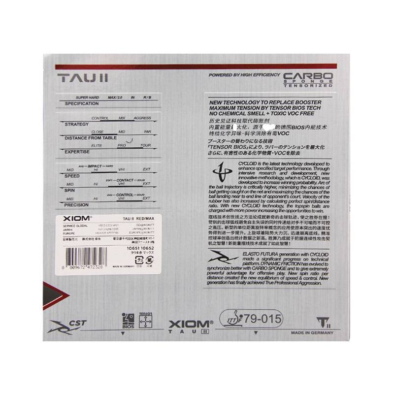 Xiom tau II Свойства: липкий Характеристика: Шестое поколение внутренней энергии тензора Метод атаки: рядом со средним тайваньским быстрым типом атаки Научно-техническая коннотация: тензорная внутренняя энергия немецкого выброса, зеленый BIOS и защита окружающей среды, скрученная высокоэнергетическая углеродная губка carbo spin, китайская технология вязкости CST, динамическое трение, циклоидная технология, концепция будущей энергетической технологии производства elasto Futura, Для настройки: Резина: Улучшенный резиновый материал, новая структура частиц, Губка: Улучшенная легкая структура торта высокой плотности, Толщина: Макс Твердость: твердая, Эксплуатационные характеристики (по сравнению с вегой тур): Внутренняя энергетическая мощность + + (увеличена на 10%), Скорость удара + + (увеличена на 8%), Вращение хода + + (увеличение на 5%), Точность ватина + + + (увеличена на 8%), Управление Сенсорное + + (увеличение на 5%), Прочность резины + + + (увеличена на 20%), Вес резины-(уменьшение на 5%)