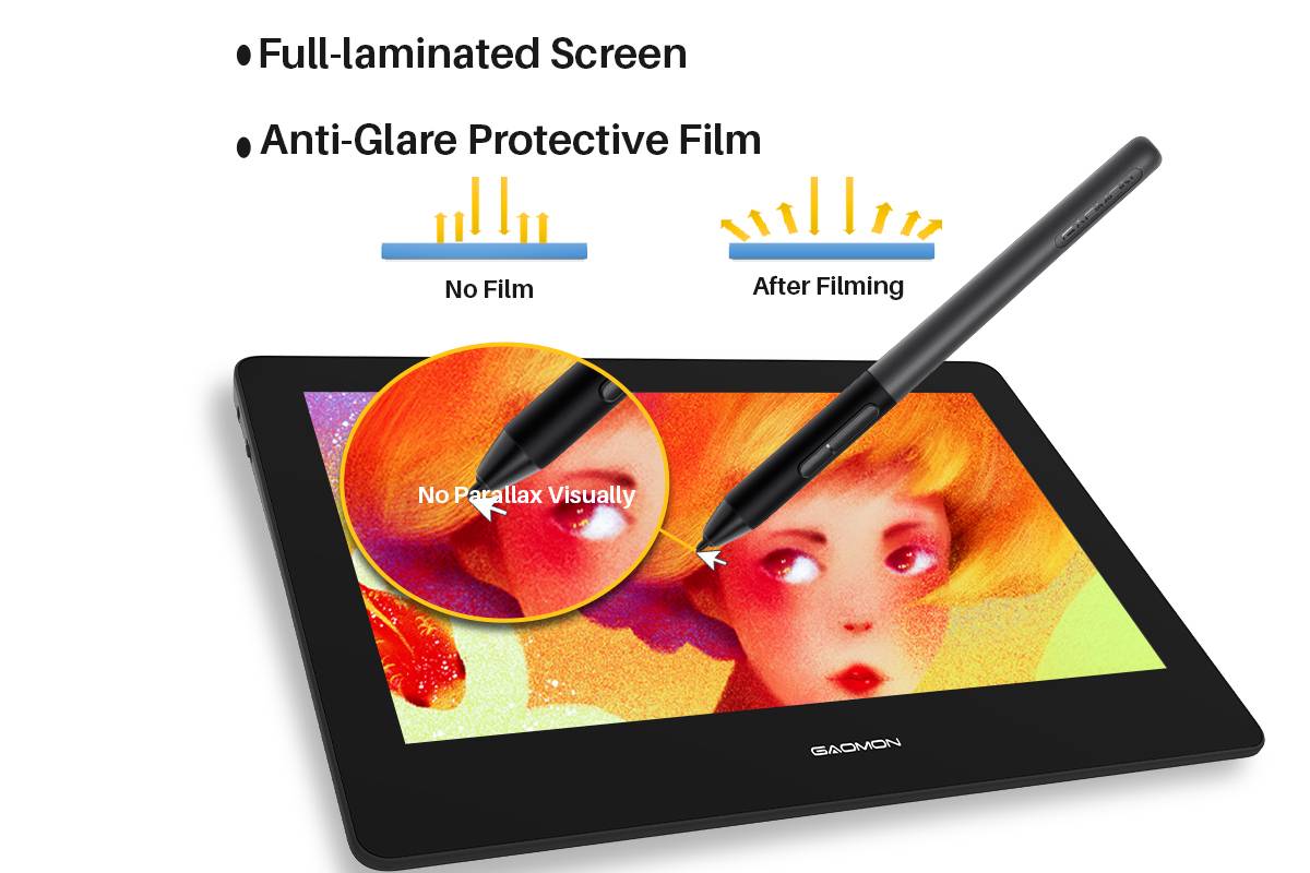 GAOMON PD1320 использует полностью ламинированную технологию, она плавно соединяет внешний экран и внутренний экран практически без параллакса. Ваш курсор отображает именно то, что вы хотите.