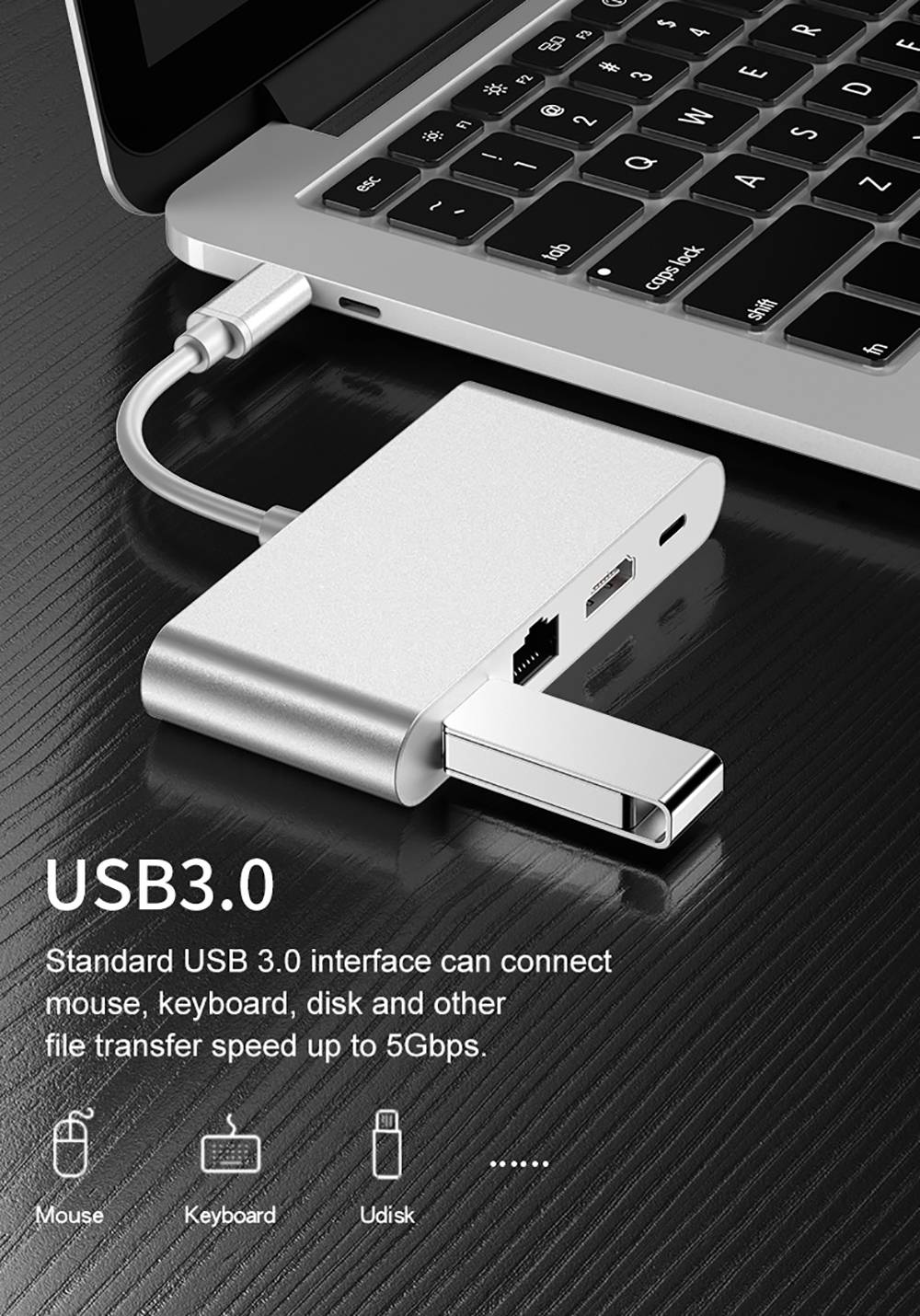 Тип 2:Type-C к HDMI-совместимому/USB3.0/Type-C.Характеристики выходных интерфейсов:1. Совместимость с HDMI: 4K(3840x2160 @ 30 Гц)/1080P/720P.2.Type C: только зарядка,3. Порт Rj45: 1000 Мбит/с.4.USB3.0: скорость передачи 5 Гбит/с, подключение мыши U-Disk, клавиатуры, телефона.Совместимый дизайн:Список поддержки ноутбука: