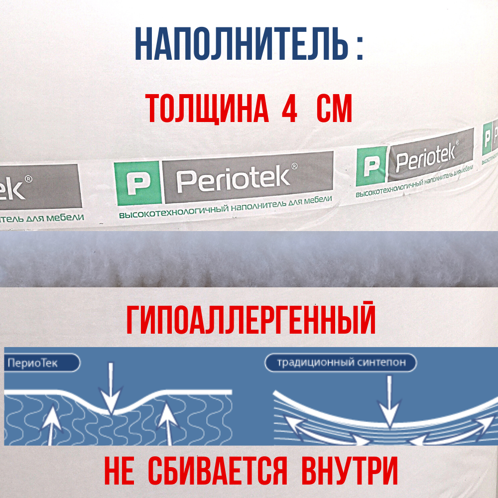Внутри — наполнитель периотек ТОЛЩИНОЙ 4 СМ (гипоаллергенный, сохраняет форму после машинной стирки, НЕ СБИВАЕТСЯ!).