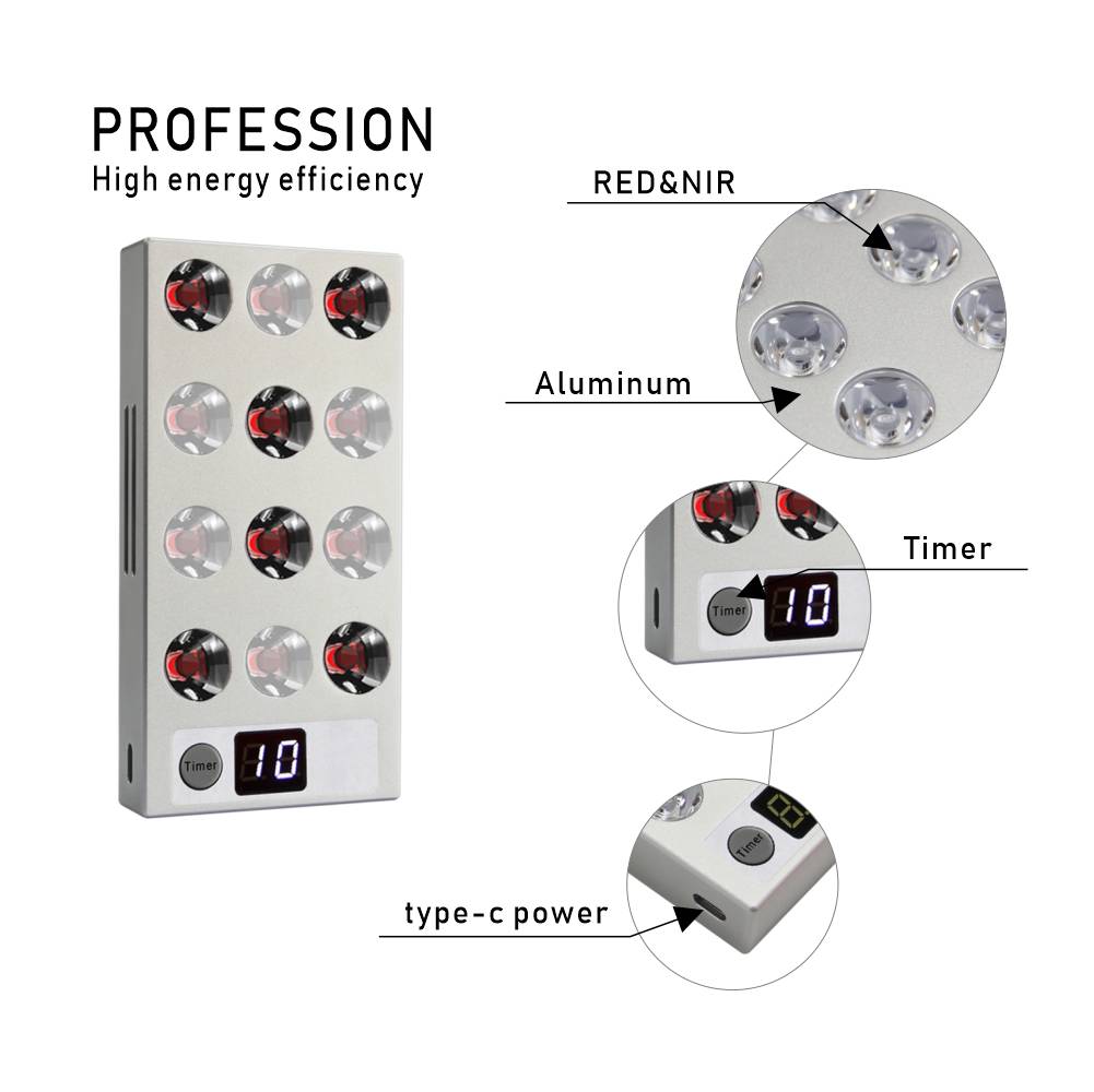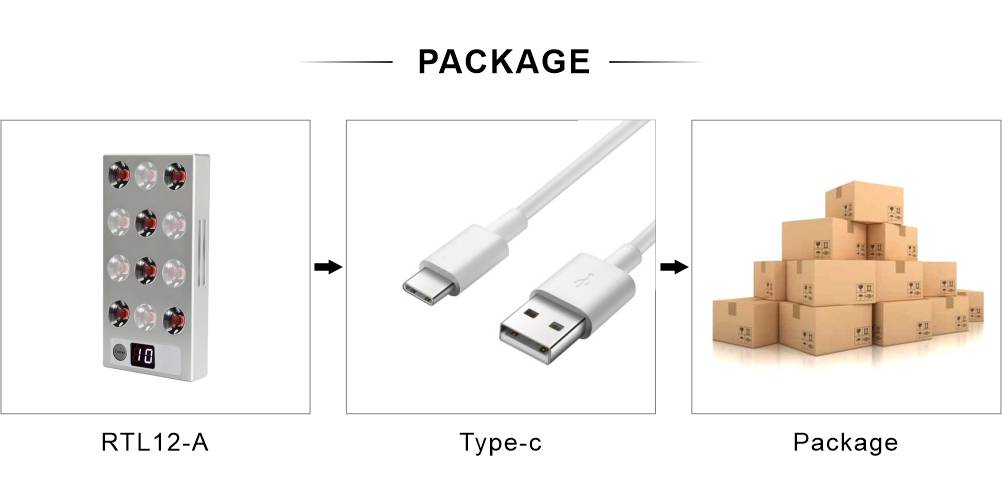 Модель (RTL12-A один чип Без перезарядки 150x76x20 мм 12*3 Вт) (RTL12-B двойной чип без Перезарядка 150x76x20 мм 12*5 Вт) (RTL12-C двойной чип с Перезарядка 150x76x30 мм 12*5 Вт) Спектр: красный, ИК, оба Входное напряжение: 5 В, поддерживает все зарядные устройства на мобильный телефон или банки питания Тип входного сигнала: Тип C Плотность мощности:> 110 МВт/см² @ 8 см discante Гарантия: 2 года Таймер: Да, по умолчанию 10 минут максимум 20 минут или без таймера