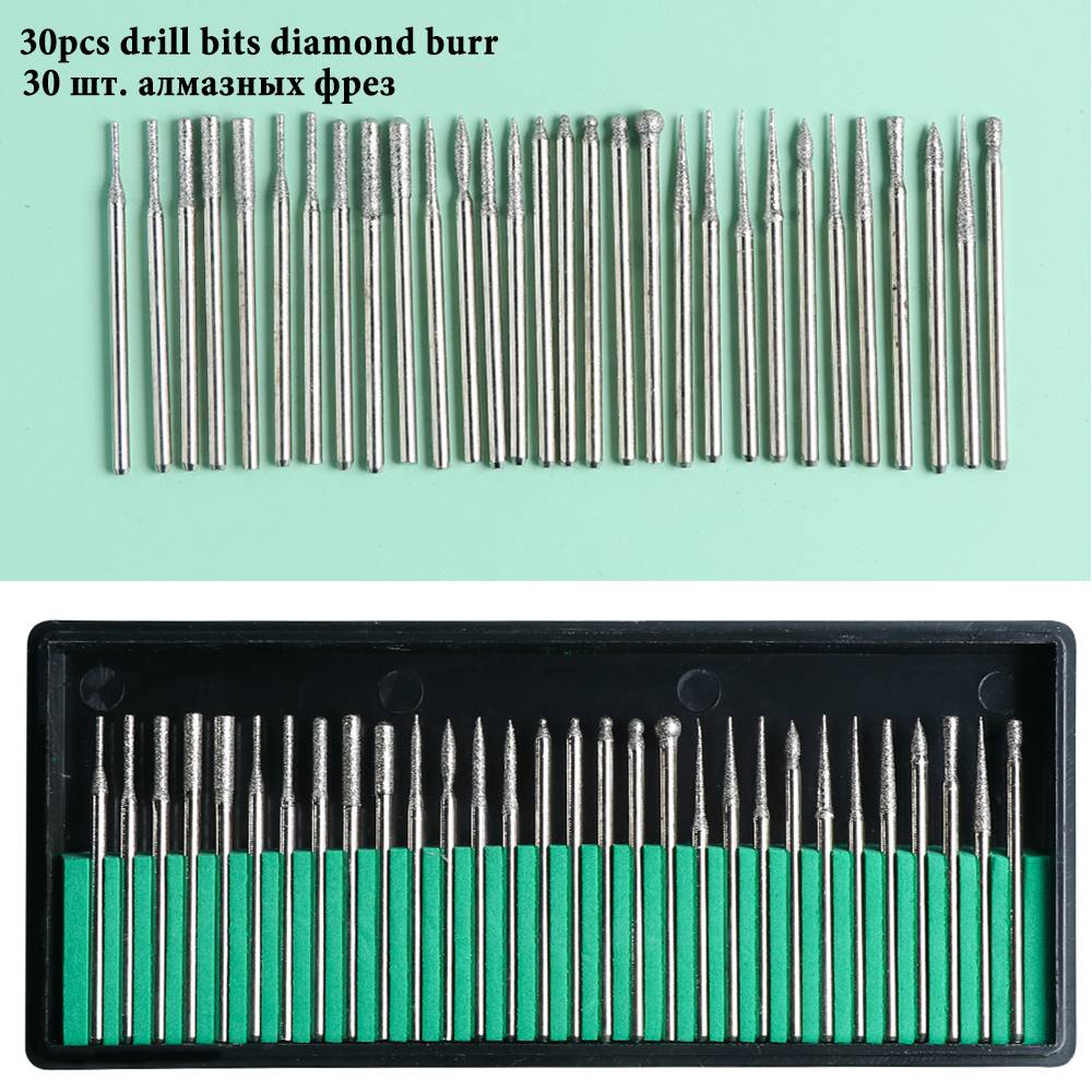 1шт. ручка-фрезер (110V/220V общий) адаптер(стандарт UK/US/EU/AU) 6шт насадки 6шт сменных наждачных наконечников 1x Руководство пользования (на английском языке) 1 Набор Фрез алмазных , 30 шт.