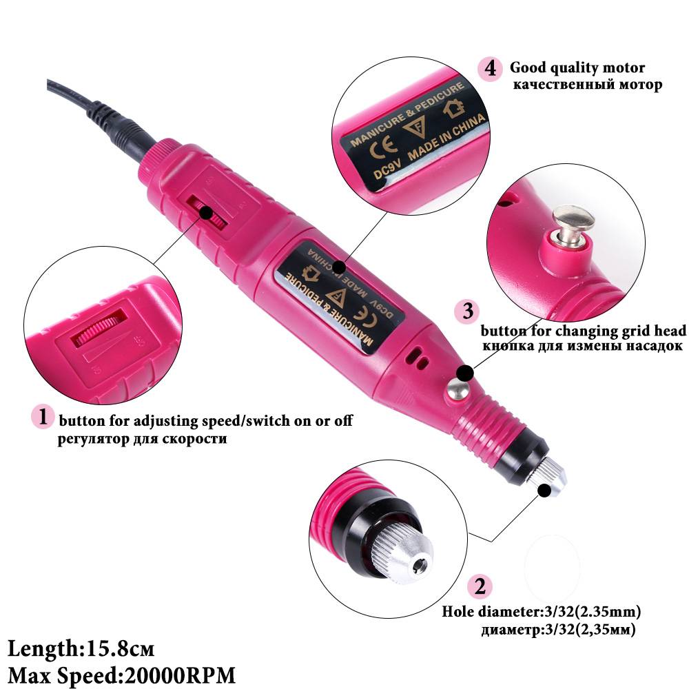 Электрический фрезер для маникюра и педикюра 20000 оборотов для выпиливания искусственных ногтей и не обрезного маникюра. В комплекте 6 насадок. Обладает высокой скоростью вращения 20000 оборотов в минуту. Плавная регулировка оборотов, регулятор оборотов находится на корпусе ручки. Характеристики: Тип крепления насадок : жесткое крепление при помощи зажимного кольца Мощность: 10 Вт Напряжение сети: 220 В, 50 Гц Комплектация: ручка-фрезер адаптер(стандарт UK/US/EU/AU) 2 насадки цилиндрической формы -для обработки края ногтя, шлифовки, удаления мозолей и огрубевшей кожи, коррекции искусственных ногтей. 3 насадки конической формы ― для легкого и быстрого удаления кутикулы, шлифовки натуральных ногтей, чистки под ногтями ( насадка в форме узкого конуса ) и финишной шлифовки. 1 насадка с 6 сменными наждачными сменными наконечниками.