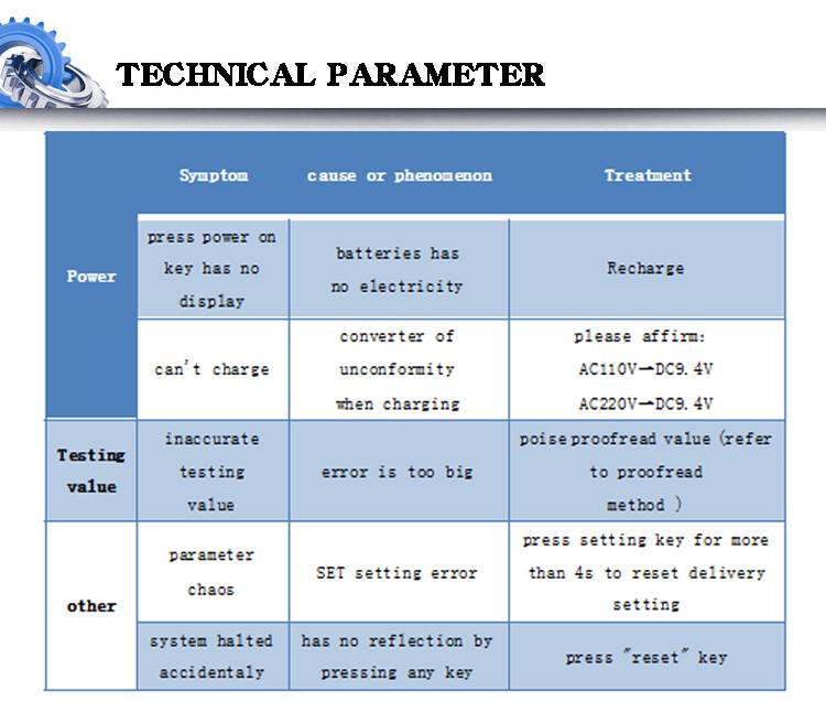 12. Режим питания: 5 никель-цианогенных батарей/220 В переменного тока зарядки 4 ~ 6 часов.