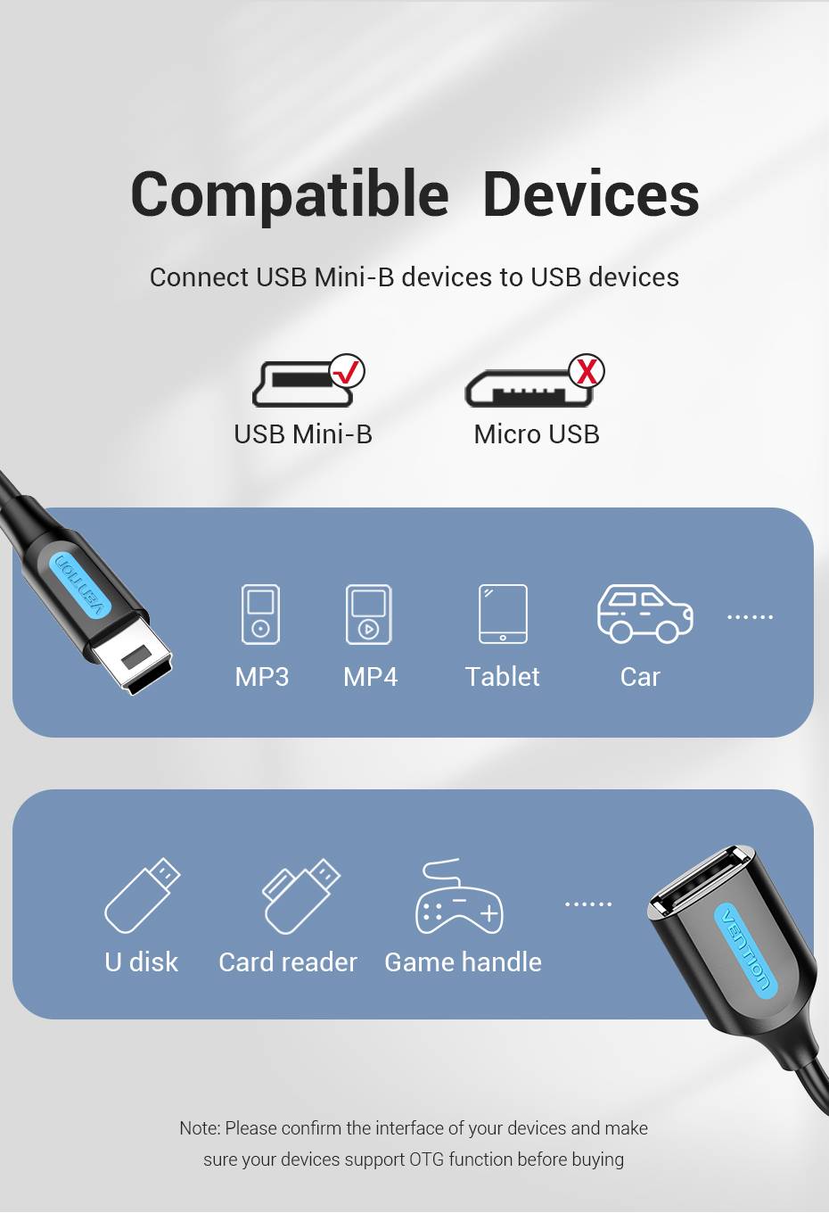 Brand NameVEnTIOnModel NumberCCTBB/VAS-A19/VAS-A51OriginMainland ChinaTypeTransfer StoreCertificationCECertificationRoHSInput Voltage5VOutput Voltage5VConnector AUSB AAmplifierNoConnector BMini USBMeasurement unitpiece/piecesSold insell_by_pieceEach pack1Package weight0.020Package size - length (cm)10Package size - width (cm)10Package size - height (cm)8compatible devicesMP3, MP4, Tablet, Car, CameraoutputU disk, Card reader, game handleFeature 1USB Mini-B Adapter, Usb Mini-B to USBFeature 2480Mbps transfer rateFeature 3OTG cableFeature 4Mini usb 2.0 OTGFeature 5Mini usb OTG CableFeature 6Mini usb Adapter