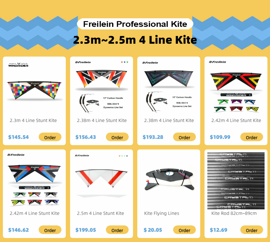 Четырехрядные воздушные змеи могут двигаться вперед или назад, летать боком, вращаться на кончике крыльев, вращаться на мертвой точке или останавливаться и парить в воздухе, на выбранной Вами скорости.