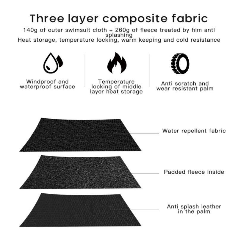 Устойчивость к холоду. Поверхностный слой защищен от ветра и водонепроницаем, средний слой удерживает тепло и блокирует температуру, а ладонь анти-