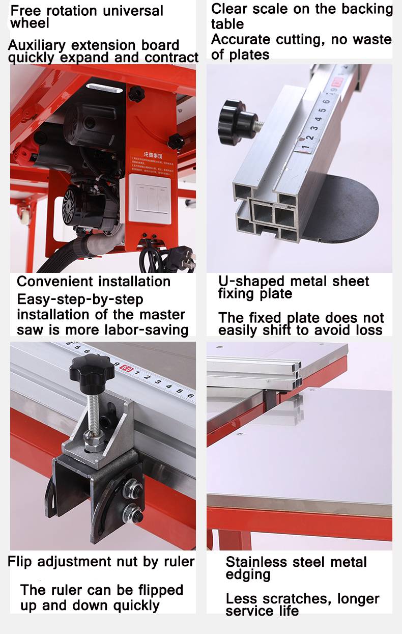 Характеристики: использование выдвижной линейки без разборки позволяет непосредственно перевернуть линейку, чтобы решить проблему неточности масштаба, вызванную перемещением толчка разделочной доски. Боковая задняя часть быстро позиционируется в течение 3 секунд, точно и надежно, не запуская доску, одна петля, нет необходимости в двух сразу вырезаемых плоских после разборки и сборки. Все углы, оснащенный 2,4 того, что наши производственные мощности включают в Телескопический линейка, может решить все ваши разделочная доска проблемы. Пила стол изготовлен из промышленного класса нержавеющая сталь толщиной 1,0. Стол пилы оснащен 3 удлинительными пластинами, которые могут лучше решить использование кривой пилы, обрезки машины и большой Гонг машины