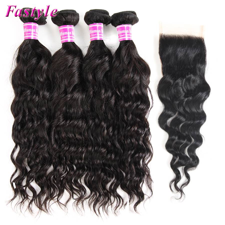 Fastyle, бразильские волосы Remy, 4x4, кружевное закрытие, волнистые человеческие волосы, пряди с закрытием, средняя свободная часть, натуральный черный цвет