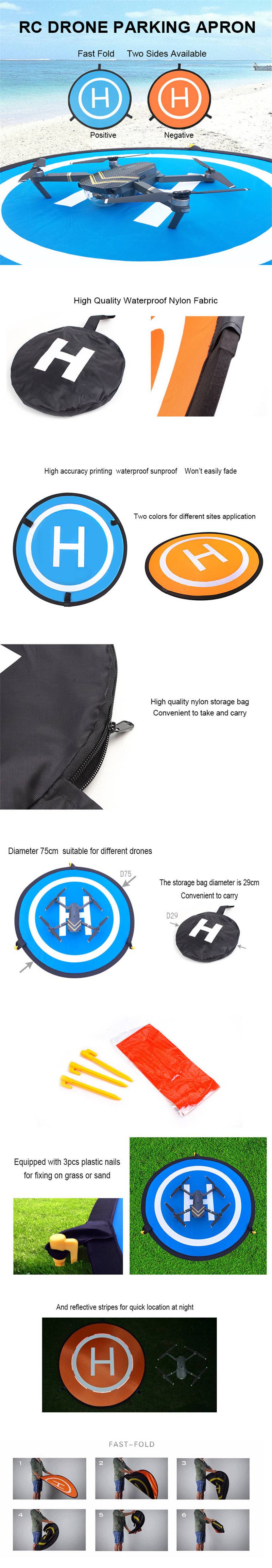 Диаметр в разложенном виде составляет 75 см, а диаметр в сложенном виде-29 см, что удобно носить с собой! Быстро складывается, легко переносится, используется с обеих сторон. Подходит для различных моделей! Совместимые модели: DJI MAVIC MINI 2/ MAVIC AIR 2/ MAVIC MINI/ MAVIC Air/ MAVIC PRO/ SPARK Phantom 3/4 / INSPIRE аксессуары для Дронов Вес нетто: 348 г Материал: водонепроницаемый Высококачественный нейлон Примечание: продается только посадочная площадка Подходит для различных дронов, в разных случаях, подчеркивает место посадки. Это аэродром в Основном предназначен для обучения начинающих садов БПЛА, также может использоваться в качестве выделенной зоны посадки во время гонки. Двухсторонний двойной цветной дизайн. Применение различных случаев, подчеркивает расположение вертолетной площадки. Отличный устойчивый к атмосферным воздействиям нейлоновый материал. Светоотражающие Полоски для быстрого расположения в ночное время. 3 шт гвозди для закрепления на траве или песке.