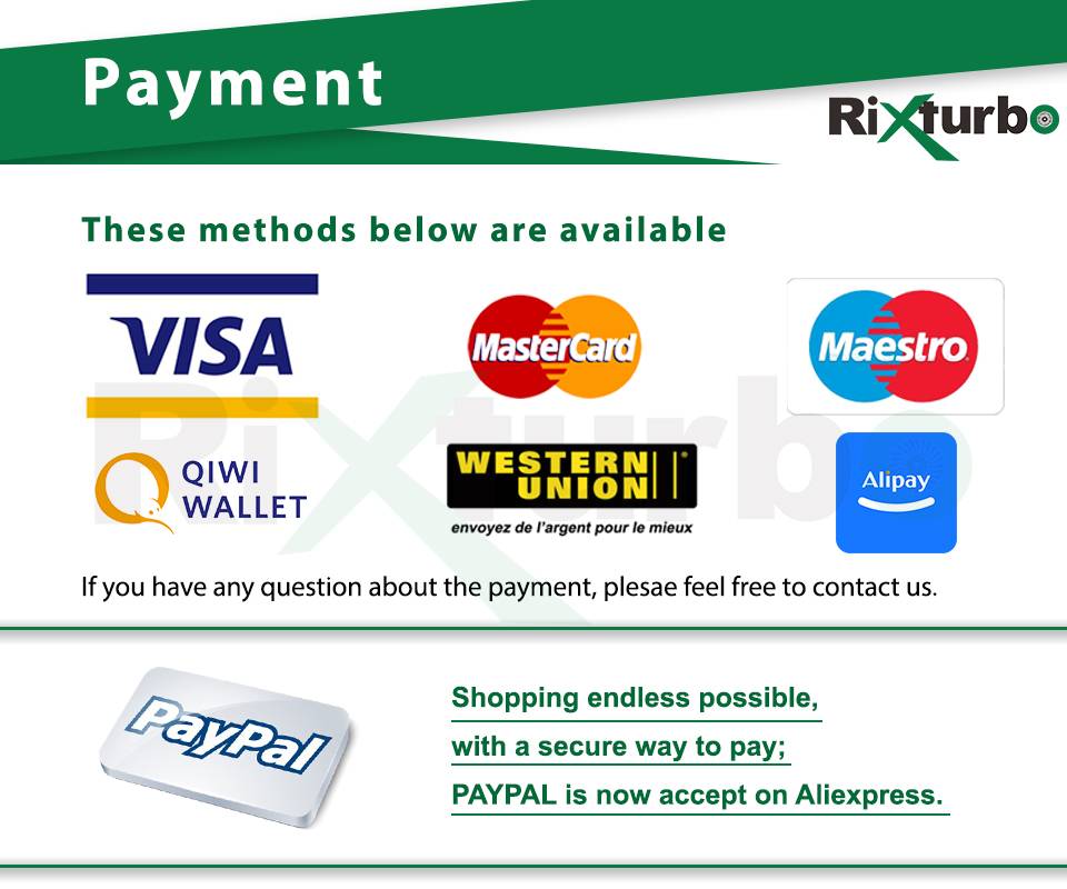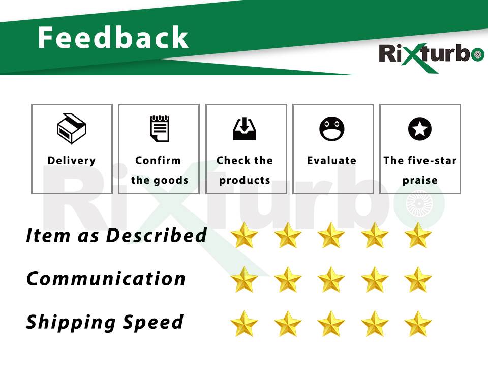 1. Почему я ничего не получил до сих пор? Вы можете проверить информацию отслеживания через global.cainiao.com/index.htm или обратиться в нашу службу поддержки клиентов. 2. Когда служба поддержки клиентов будет онлайн? Мы будем держать, чтобы помочь вам в течение 24 часов и ответим вам как можно скорее. 3. Отслеживание показывает, что моя посылка была возвращена, что я должен сделать сейчас? Пожалуйста, свяжитесь с нами, когда ваша посылка будет возвращена. Мы решим проблему, а затем повторно отправим вам посылка или вернем вам деньги. 4. Почему моя посылка не прошла таможенное оформление? НДС, налоги на импорт и другие таможенные сборы не включены в расходы, которые вы заплатили нам. Вы должны указать правильный номер телефона и вовремя оформить таможенное оформление. Пожалуйста, свяжитесь с нами как можно скорее для получения дополнительной помощи, если вы не сделали таможенное оформление. Мы предоставим вам контактную информацию по индивидуальному заказу. 5. Обратите внимание перед заказом турбо. Пожалуйста, проверьте номер детали на вашем полном турбо. Вы также можете связаться с нами для помощи, если вы не уверены в вашей модели. 6. Об установке. ①Замените масло и фильтры ② очистите масляную трубу. ③ удерживайте в течение 3 минут, когда вы начинаете или закрываете двигатель.