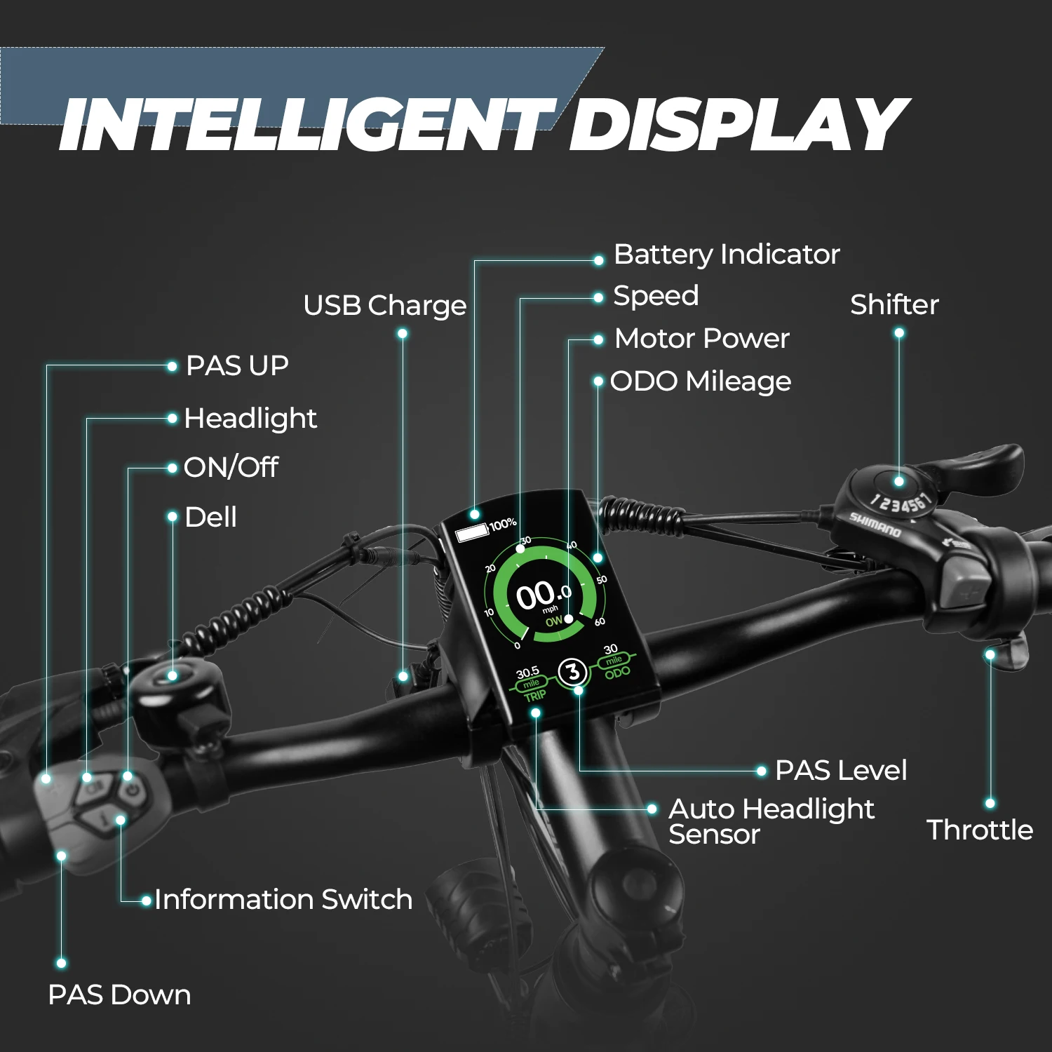 ★Интеллектуальный цветной светодиодный дисплей обеспечивает цифровой дисплей, предлагающий индикатор заряда батареи, скорость, usb-порт для зарядки, мощность двигателя и дальний светодиодный индикатор.