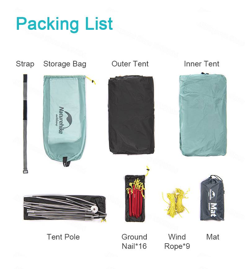 Упаковочный лист: Ремешок/внешний мешок/Внутренняя палатка/внешняя палатка/шатер Полюс/наземный Nailx16/Ветер Ropex9/Бесплатный напольный коврик