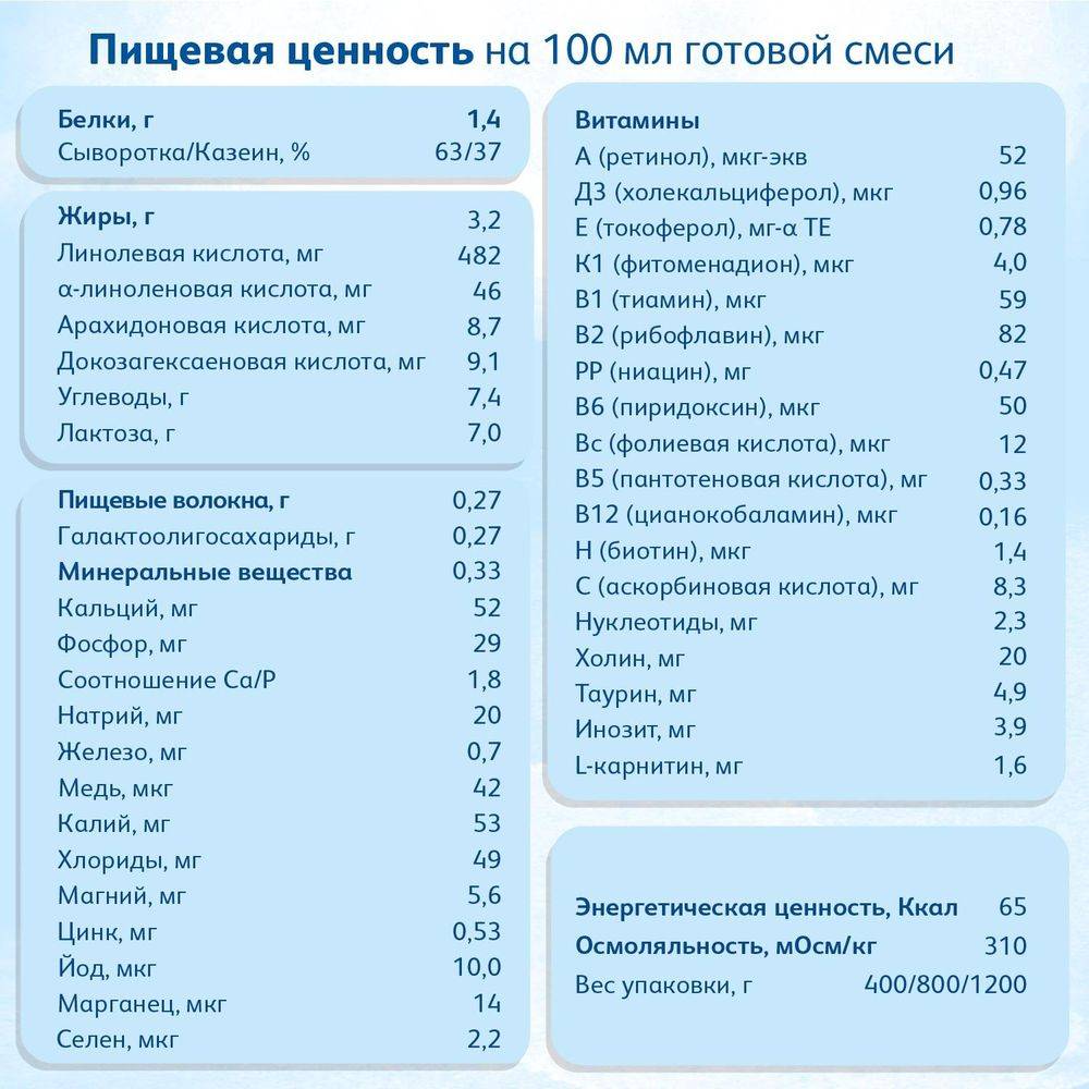 Содержит специальные жирные кислоты (DHA и ARA) для развития головного мозга и зрения у детей; пребиотики (галактоолигосахариды) для формирования полезной кишечной микрофлоры; нуклеотиды для укрепления иммунной системы;все витамины и минералы для здорового роста и развития ребенка с рождения до 6 месяцев
