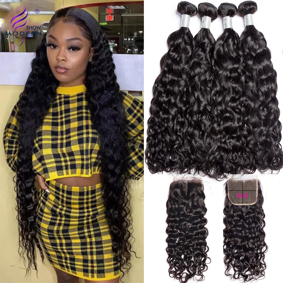 Современный танец шоу волнистые пучки с закрытием 3/4 пучки волос с 4x4 кружева закрытие волосы Remy бразильский человеческих волос с закрытием