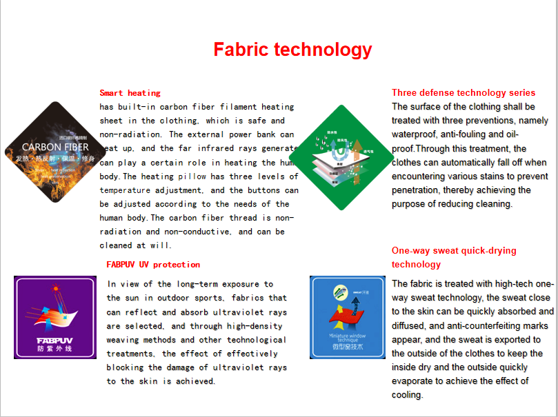 3. Нагревательная пленка и переключатель обновления, живот, спина, воротник имеет функцию нагрева, внутренние нагревательные компоненты используют японский импортированный провод из углеродного волокна, Непроводящий, стабильный нагрев, длительный срок службы; переключатель Обновлен для двойного управления, может быть отрегулирован до и после нагрева по желанию.