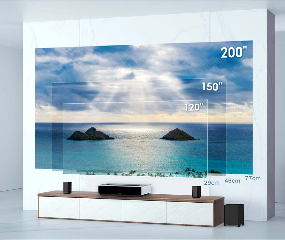 0,25: 1 большая глубина поля ультра-короткий фокусный объектив дизайн, размещенный на ТВ шкаф может проецировать супер большое изображение более 100 дюймов. Не беспокойтесь о подъеме и проводке, нет внутреннего пространства, попрощайтесь с окклюзией экрана.
