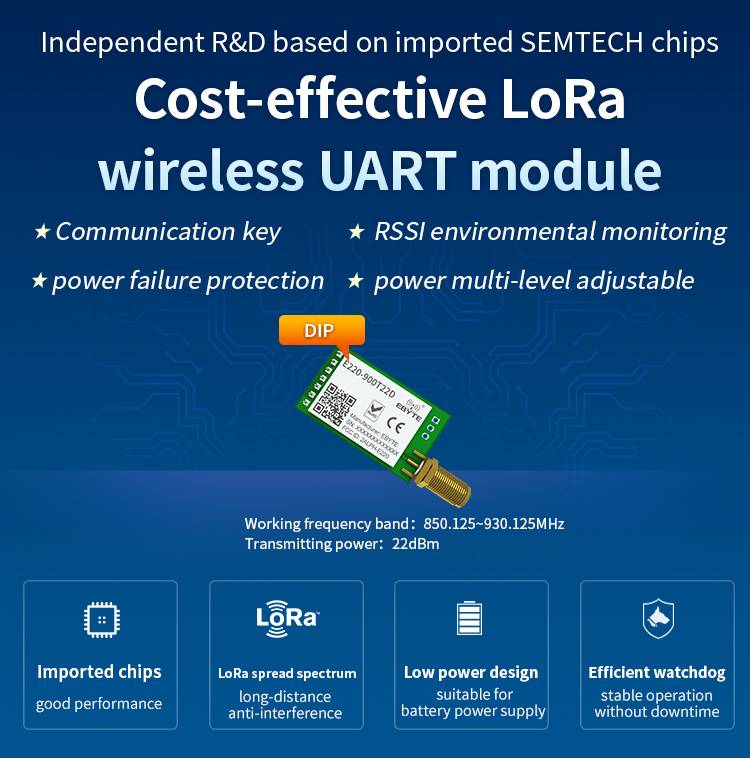 [Введение]:E220-900T22D использует новое поколение технологии расширенного спектра LoRa и модуль беспроводного последовательного порта (UART) на основе схемы микросхемы LLCC68. Он имеет различные методы передачи, работает в (850125 ~ 930125 МГц) (по умолчанию 873125 МГц), на выходе уровня TTL, совместим с напряжением порта ввода-вывода 3,3 В и 5 В