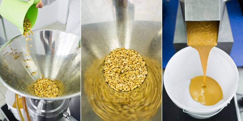 После этого орех (хотя арахис это вовсе не орех. Он относится к бобовым) перемалывается на мельнице. Помол происходит до достаточно мелкой фракции. При помоле из арахиса выделяется масло, которое в нём содержится. Так и получается арахисовая паста.