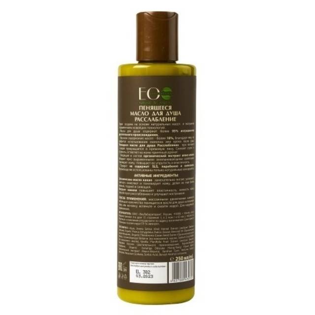 Масло для душа содержит более 95% ингредиентов растительного происхождения. Высокое содержание масел – более 10%, благодаря чему не требуется использование молочка или крема после душа. Пенящееся масло для душа «Расслабление» при контакте с водой превращается в кремовую пену. Снимает стресс и усталость, оставляет на коже приятный аромат.