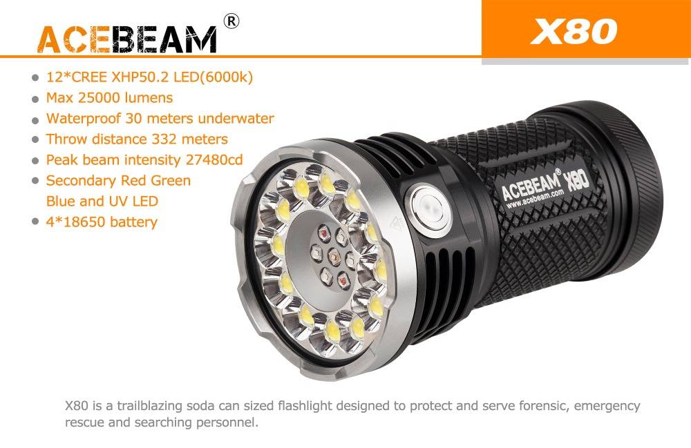 Максимальная мощность 25000 люменов с помощью 4*18650 Acebeam литий-ионных аккумуляторов с высокой разрядкой;