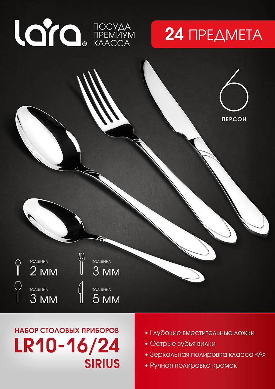 Столовые приборы LARA изготовлены из стали с 18-процентным содержанием хрома и имеют зеркальную полировку класса "А".