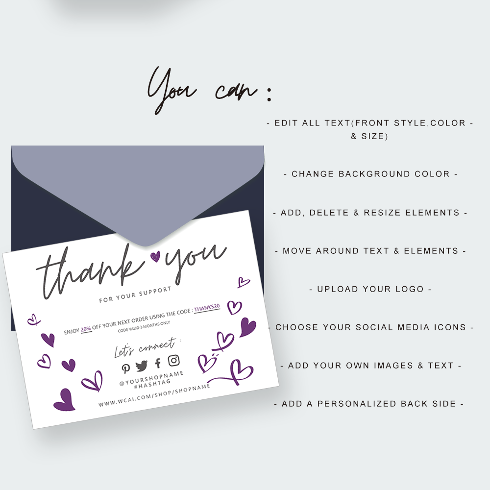 Двусторонний шаблон благодарности с сердцем, спасибо за ваш заказ карты для малого бизнеса, онлайн-бизнес спасибо за посылка