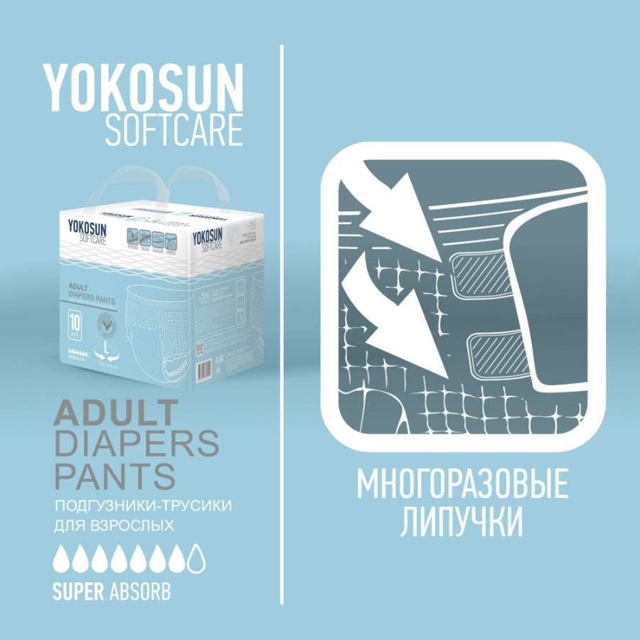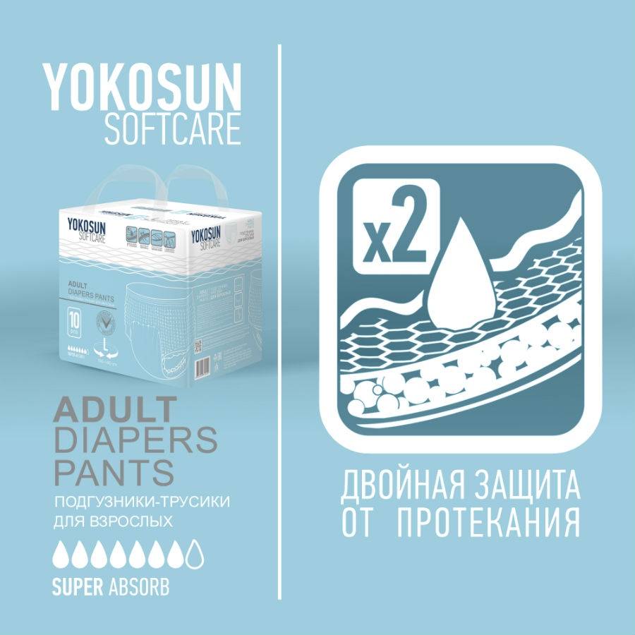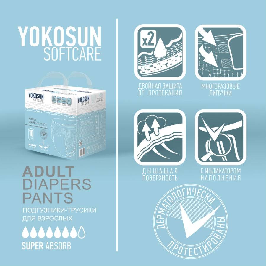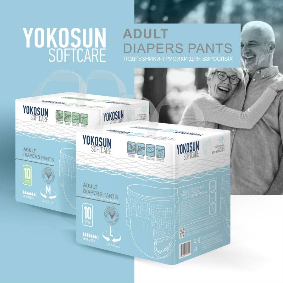 Yokosun adult panties are new breathable adult panties designed for active people and lying patients with medium and severe incontinence. Made of environmentally friendly materials without the use of chemical bleach and perfume perfumes. Hypoallergenic, dermatologically tested.