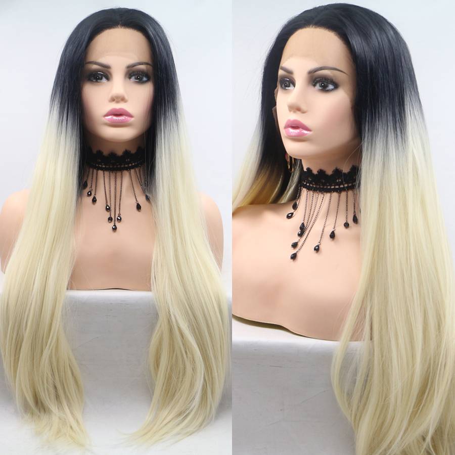 Color:613 Ombre Blonde Dark Roots Color Hairstyle: Straight Hair Hair length: Long Hair Lace cap: Lace Frontal Wigs Construction:Comfort breathable cap with adjustable straps Hair type: High quality heat resistant fiber Cap construction: Soft breathable cap with adjustable straps.