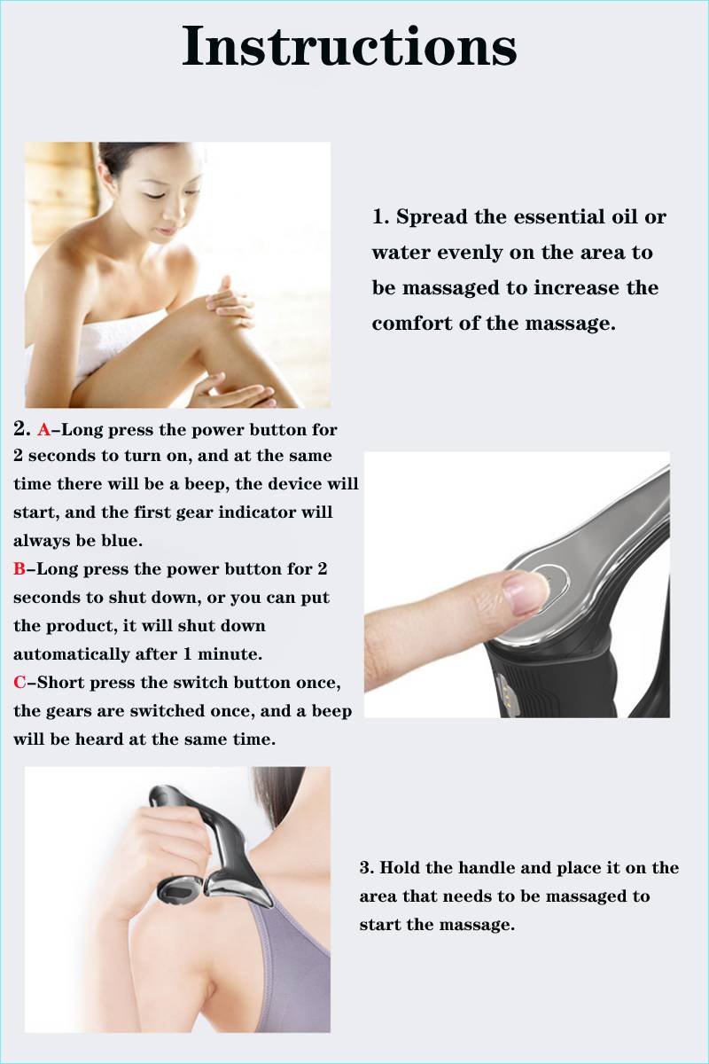 Пожалуйста, обратите внимание: во время использования продукта, рука, держащая ручку, будет иметь различное чувство стимуляции микро-тока. Это не утечка продукта, а нормальное явление. Первое использование массажера для ножей fascia должно начинаться с низкого зубчатого механизма.