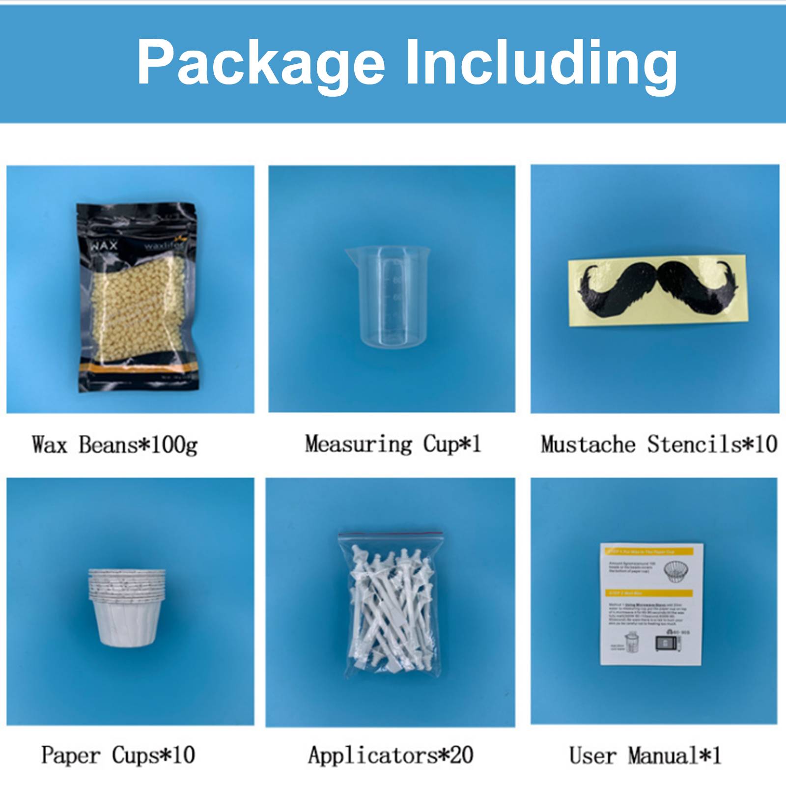 В комплект входят 20 восковых палочек, 1 пакет восковых бобов, 10 наклеек на усы, 1 мерный стаканчик и 10 бумажных стаканчиков.