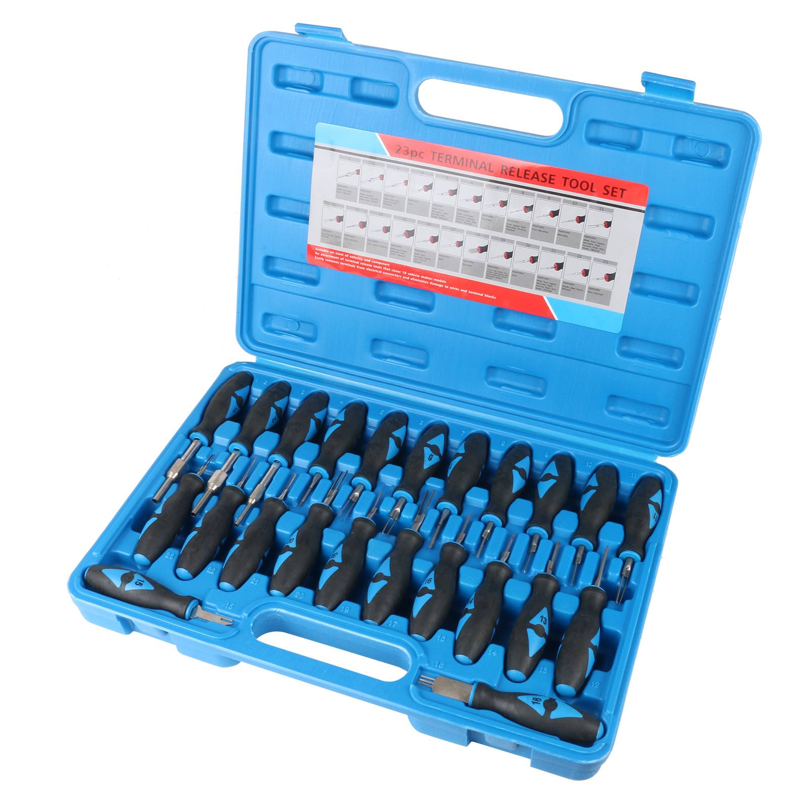 Содержит 23 шт терминал релиз инструменты для большинства отечественных, европейских и японских автомобилей и грузовиков.